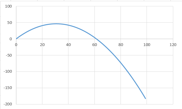 이를 이용해서 main에서 적분을 하고 이를 txt 파일로 저장한 다음 excel로 포물선 운동을 확인할 수있습니다.
