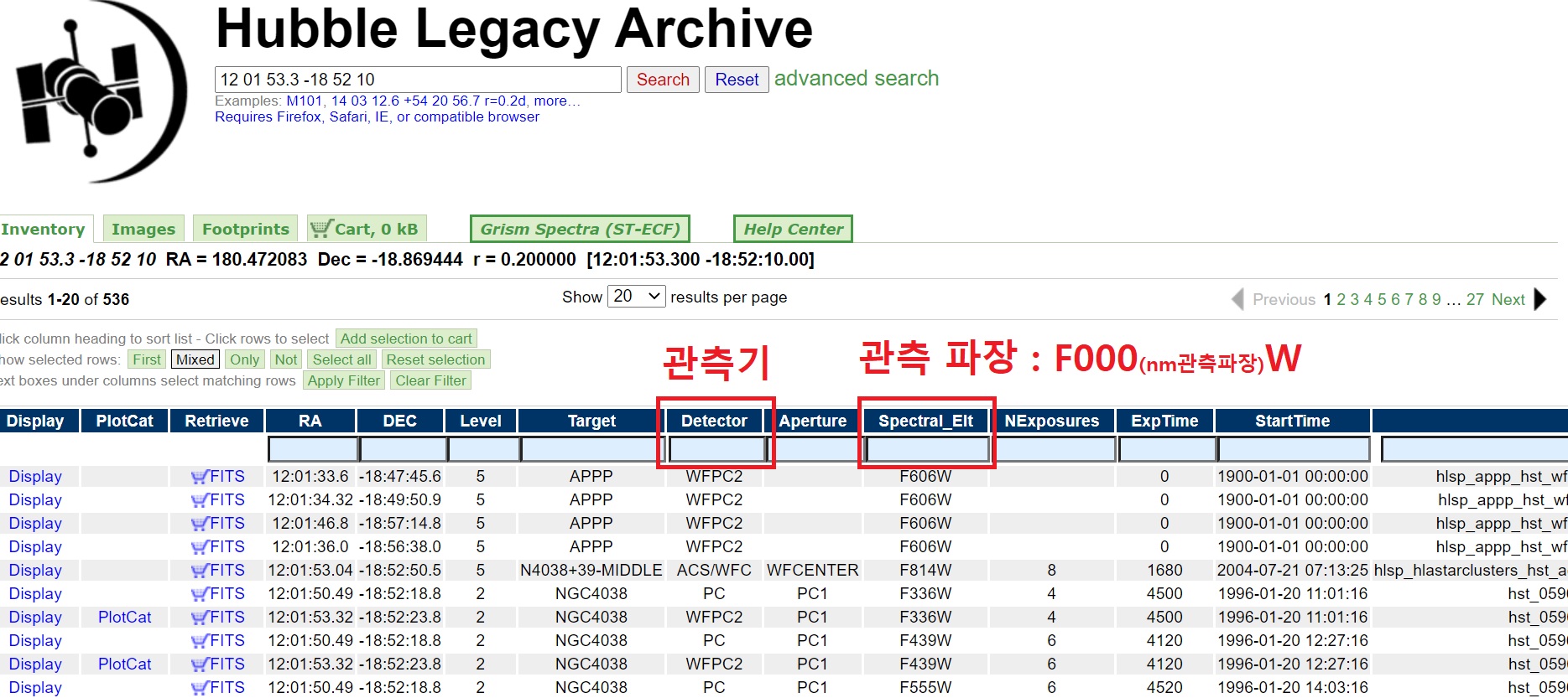 예를 들어 F550W는 550nm로 관측하였다는 뜻입니다.