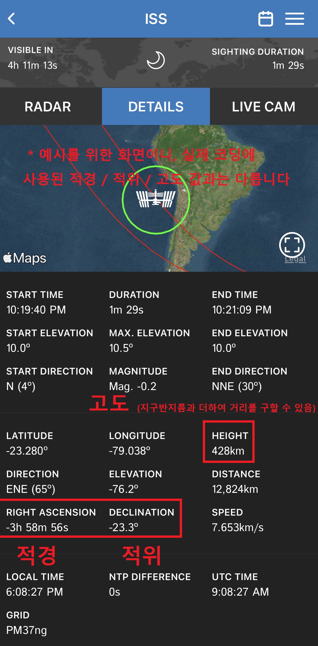 그리고 적경과 적위, 그리고 거리를 유도하기 위한 국제우주정거장의 고도값은 ISS Detector 어플리케이션을 통해 다음 사진과 같은 위치에서 구할 수 있습니다.