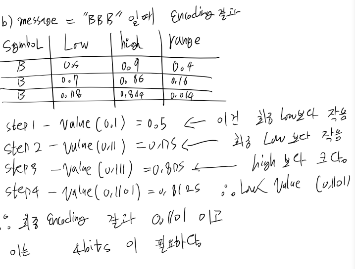규칙은 우선은 0.로 시작할 때 무조건 1을 붙이는 것입니다. 여기서 1을 붙이면 0.1이 되고 이는 10진수로 0.5가 됩니다. 해당 값은 어떤가요? Low(0.78) 보다 낮습니다. 고로 바로 이어서 1을 붙입니다. 그러면 0.11을 획득하게 됩니다. 이는 십진수 값으로 0.75입니다. 어떤가요? Low 보다 작은 값입니다. 고로 또 1을 붙여줍니다. 그럼 0.111이 됩니다. 이는 0.875로 어떤가요? High보다 높습니다. 고로 다시 1을 때고 0을 붙인 후에 다시 1을 붙여줍니다. 그럼 0.1101이 됩니다. 해당 값은 어떤가요? 0.8125입니다. 정확히 High와 Low 사이로 들어왔으므로, 인코딩 과정을 종료해줍니다.