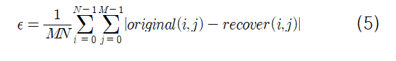 마지막으로 DCT와 Quantization 된 값을 복구한 결과 표9의 값을 얻을 수 있었는데 해당 값은 표3 즉 기존 값과 비교했을 때 육안으로 큰 차이가 없어보이는 것으로 확인되었다. 이에 대해 자세히 조사하기 위해 수식5에 나타낸 MAE(Mean Absolute Error)와 원본과 복구본의 Error를 계산하도록 하였다.