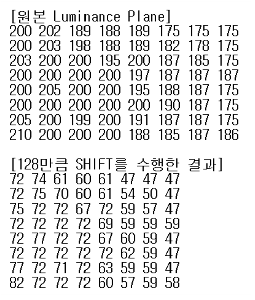 우선 예제 블록을 표3과 같이 준비한다. 해당 블록을 Dct Class에 ReadMat 함수를 이용해 멤버 배열에 저장한 후, -128만큼 값들을 이동시키기 위해 ShiftLuminancePlane 함수를 호출해 해당 값들을 –128만큼 이동시킨다.