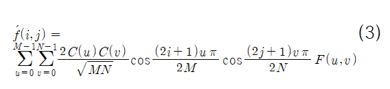 수식3은 IDCT 연산이다. 해당 수식은 특정 (i,j)에 대한 수식3의 결과를 도출하는 float IdctSigma(int,int) const 함수와 IdctSigma(int,int) 함수의 결과를 이용해 모든 가능한 (i,j)에 대한 연산을 수행해 결과적으로 IDCT 결과를 수행하고 저장하는 void InvTransform() 함수에 사용되었다.